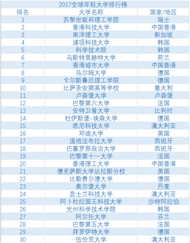 在这份年轻大学排行榜中,来自瑞士的苏黎世联邦理工学院拔得头筹,位列第二的是建校仅26年的香港科技大学,新加坡南洋理工大学位列第三。此外,进入年轻大学前十名的高校还有:浦项科技大学(韩国)、韩国科学技术院(韩国)、马斯特里赫特大学(荷兰)、香港城市大学(中国)、乌尔姆大学(德国)、卡尔斯鲁厄理工学院(德国)和比萨圣安娜高等学校(意大利)。以下为2017全球年轻大学榜TOP30详细名单: