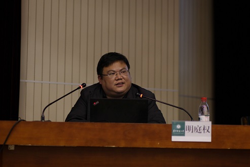 明庭权教授以十九大的概况为开篇,介绍了十九大的召开情况,分析了十九大的主要成果及重大意义。之后他通过列举大量具体事例对十九大报告所提到的过去五年新成绩、中国社会主义进入新时代、中国共产党的新使命、建设现代化经济体系、发展社会主义民主政治、推动社会主义文化繁荣兴盛、加强和创新社会治理、建设美丽中国等十三部分内容进行了全面而精彩的解读,逐一历数了中国过去五年取得的辉煌成绩,详细阐释了新时代中国特色社会主义十四条基本方略,深刻剖析了决胜全面建成小康社会的战略安排,并结合大量史实重点解读了十九大报告对台湾问题的阐述,通过中外对比展示了我国在军事、外交领域取得的巨大进步,同时也指出了我国现在所面临的艰巨任务,对十九大报告首次提及的青年工作,明教授也给出了自己独到的分析和见解。
