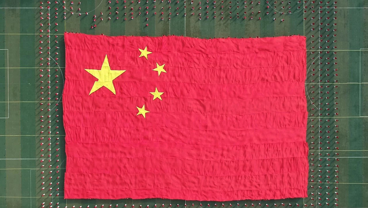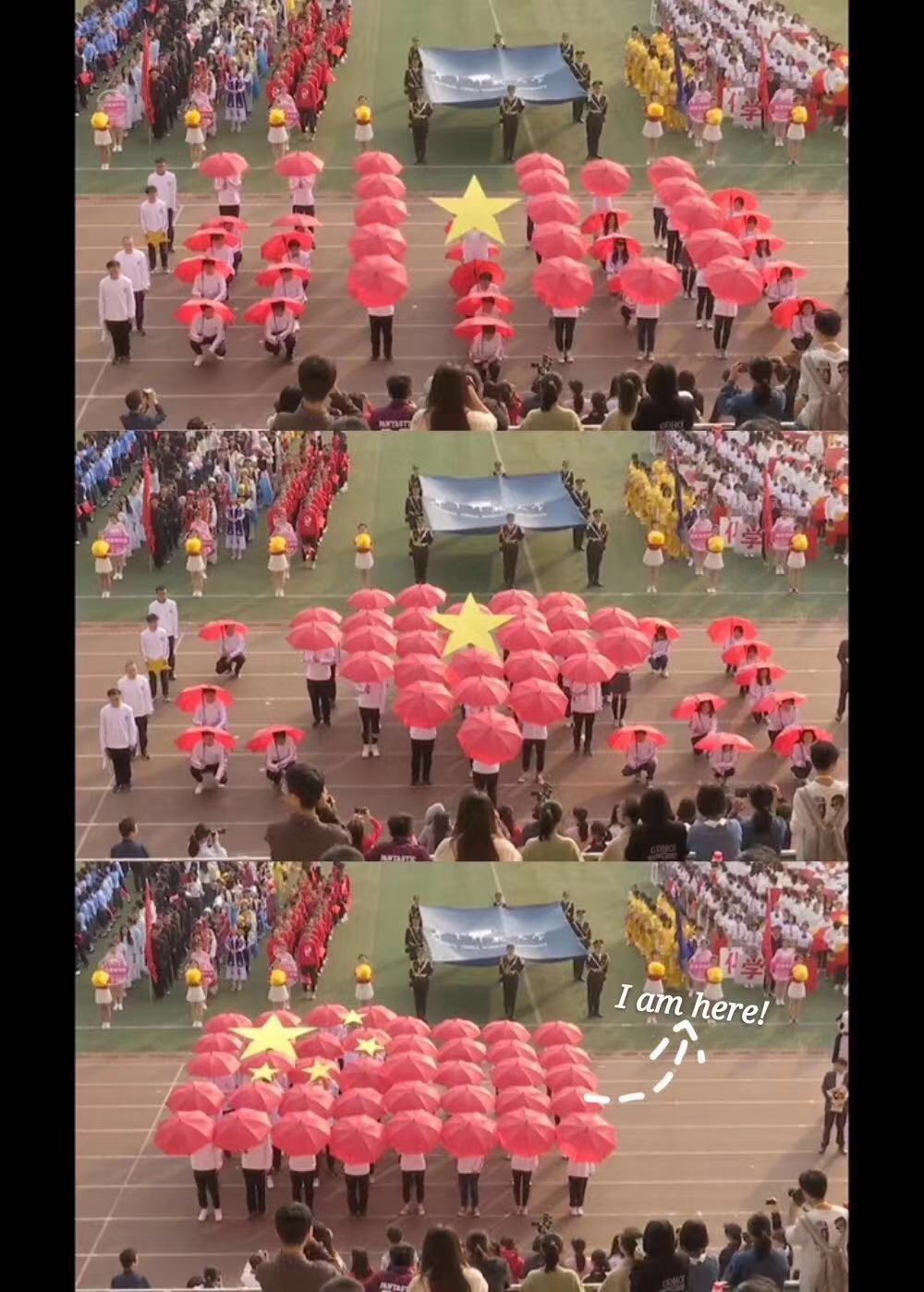 (数把红伞点点星,汇聚成熟悉的五星红旗)