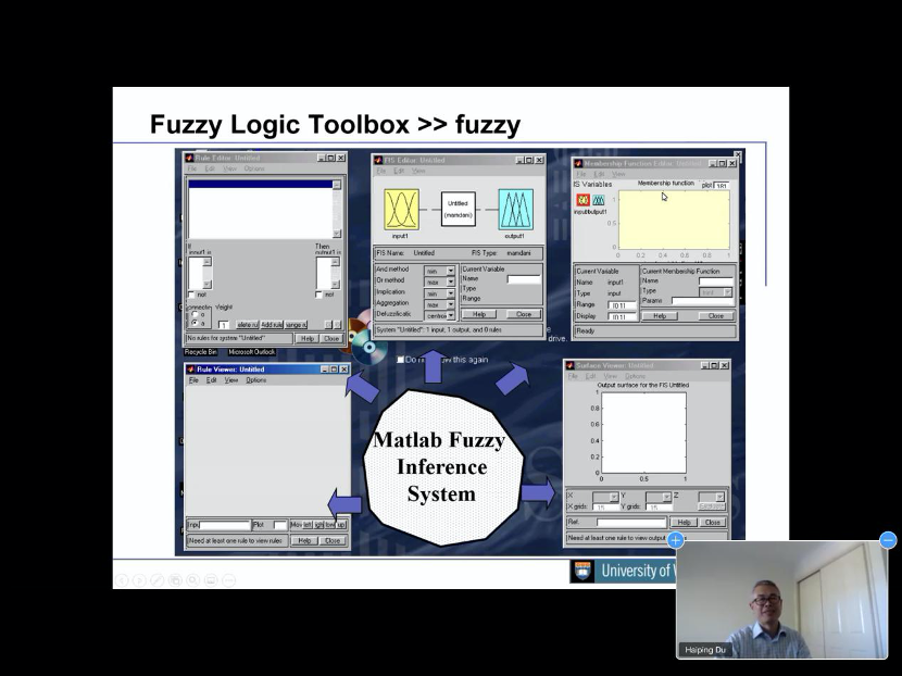 第一场讲座Haiping Du教授主要说明了模糊集的概念,解释其从属函数,语意变数,及MATLAB中的模糊逻辑工具箱的理论知识。第二场讲座Haiping Du教授则更多地结合工程实践和模糊推理系统,阐述了“模糊输入”,“应用模糊算子”,“塑造模糊集”,“组合结果去模糊化”这一系列流程的原理和公式推导,并依据这些步骤完成模糊逻辑控制器的设计。最后,讲座以Haiping Du教授在MATLAB中运行展示“水位控制器”的仿真结果结束。