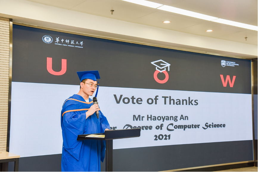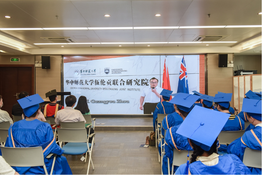7月24日下午,伍伦贡联合研究院2021年硕士研究生毕业典礼暨伍伦贡大学学位授予仪式在南湖综合楼7001报告厅举行, 2020届80名毕业生和2021届114名毕业生通过线下和线上相结合的方式共赴毕业之约。人工智能教育学部党委书记罗丽华、伍伦贡联合研究院院长余新国教授,人工智能教育学部党委副书记黄涛、伍伦贡联合研究院副院长吴和林出席现场毕业典礼,澳大利亚伍伦贡大学荣誉校长Christine McLoughlin女士、副校长Alex Frino教授通过视频方式分别致辞并宣读学位授予。典礼由吴和林主持。