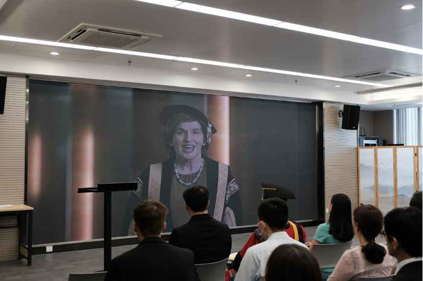 伍伦贡大学名誉校长Ms Christine McLoughlin通过视频形式代表伍伦贡大学向所有毕业生致辞,她表示,在积极应对疫情挑战的同时,同学们依然认真完成课程学习与考核,为大家在特殊时期的优异表现而由衷感到骄傲。