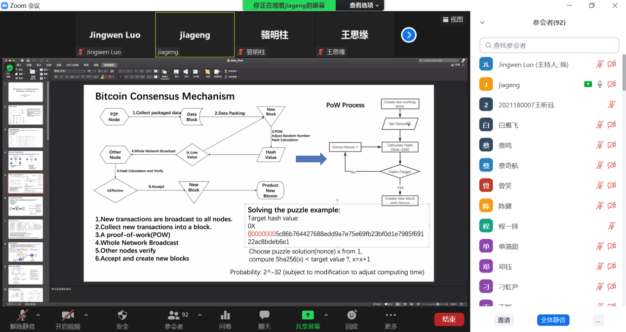 陈嘉耕副教授讲述了近几年火热的电子货币的相关知识,拨开了比特币的神秘面纱,让同学们透过感性的狂热,理性的了解了电子货币背后的一些理论基础。陈老师以最热门的比特币为例,讲述了区块链技术在电子货币中如何应用。