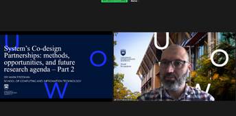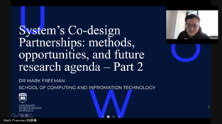 11月25日和12月2日,伍伦贡联合研究院先后举办了两场主题为“系统的协同设计伙伴关系:理论、方法与未来”的系列学术讲座。讲座由来自伍伦贡大学的高级讲师Mark Freeman博士主讲,伍伦贡联合研究院教师牛磊副教授主持。