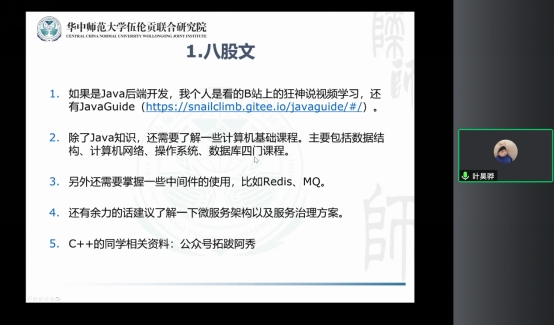 为进一步加强学生对当前就业形式的认识,增强就业观念、提高自身求职竞争力,联合研究院举办的“职”点迷津,薪火相传就业经验分享会第一场互联网专场于3月13日下午拉开帷幕。本次分享会采用腾讯会议在线方式,邀请了梁梦依,宋琳,蔡俊峰,叶昊骅和王笑天五名学生进行分享与交流。