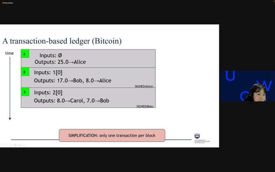 Yannan Li博士给大家介绍了一个比特币中基于加密的分类账。加密货币分类账是一种记录保存系统。该分类账以匿名方式维护参与者的身份、各自的加密货币余额,以及网络参与者之间执行的所有真实交易的记录。下图中展示了三笔交易,第一笔是铸币交易,第二笔是Alice把第一笔中的25个比特币给了Bob17个,自己给自己找零8个,第三笔是Bob把自己的17个比特币给了Carol8个,给自己找零7个。