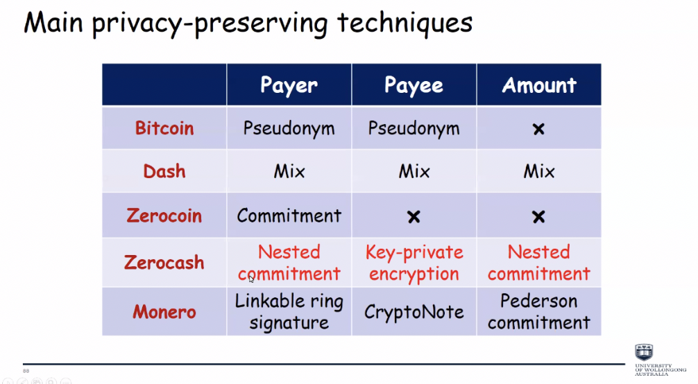 讲座最后,Yannan Li博士还为大家讲解了主要隐私保护技术,下图第一列是各种虚拟货币,第一行是对三种身份的隐私性讨论,Yannan Li博士解释了各个币种对对应东西隐私保护的手段或技术。