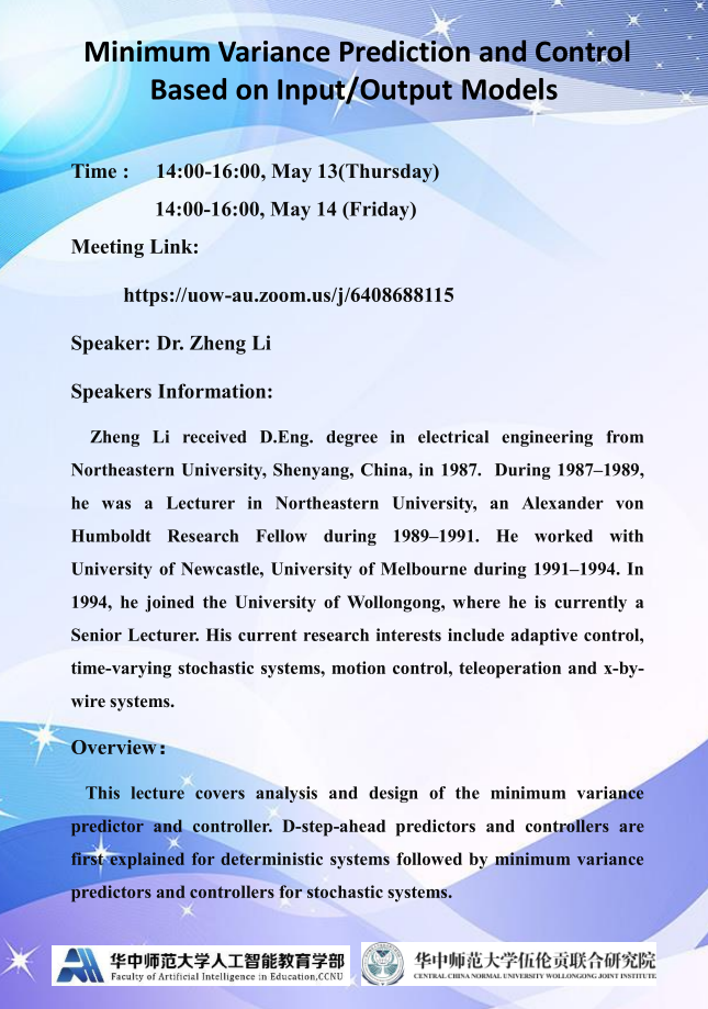 Zheng Li received D.Eng. degree in electrical engineering from Northeastern University, Shenyang, China, in 1987. During 1987–1989, he was a Lecturer in Northeastern University, an Alexander von Humboldt Research Fellow during 1989–1991. He worked with University of Newcastle, University of Melbourne during 1991–1994. In 1994, he joined the University of Wollongong, where he is currently a Senior Lecturer. His current research interests include adaptive control, time-varying stochastic systems, motion control, teleoperation and x-by-wire systems.