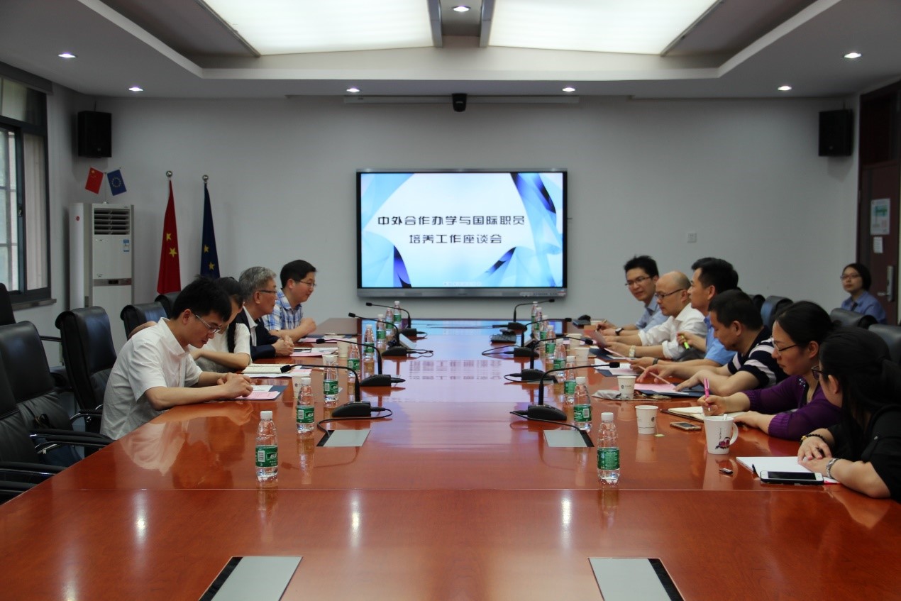 “中外合作办学与国际职员培养工作”座谈会由中欧清洁与可再生能源学院副院长易辉主持。座谈会上,华中科技大学国际交流处副处长邱勇介绍了学校国际交流工作,研究生工作部副部长黄贝娜介绍了我校国际组织后备人才的培养情况、举措和思路。湖北工业大学国际学院副院长孙炳文、华中师范大学伍伦贡联合研究院副院长吴和林、华中科技大学中欧学院院长罗小兵介绍了各自合作办学与国际人才培养情况。