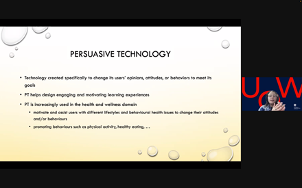 伊莲娜·乔治耶夫斯卡讲解到说服性技术是一种为了改变用户的观点、态度或行为而专门创建的技术。说服性技术设计可以吸引人的注意力并对于人的学习体验给予激励,它被越来越多地用于健康领域,激励并帮助那些有着不同的生活方式和行为健康问题的用户,改变着他们的态度和行为,促进着他们进行更多的体育活动。