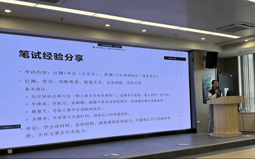 谢奔翌介绍了公务招考的类型和考试内容,建议大家先过知识点和方法,早准备、多练习、多刷题,学会战略性放弃,多模考和训练自己的答题速度。她说,申论方面要学会读材料、总结材料,多写多练习大作文,关键是要去学习思路和角度。她还提到,一般公务员的面试形式包括结构化面试、无领导小组和结构化小组,建议大家多了解面试考试形式,及早准备面试,分题目、分类型对自己复习过的面试题目进行总结复盘,多开口、多练习,最好能够找搭档一起练习、相互点评。