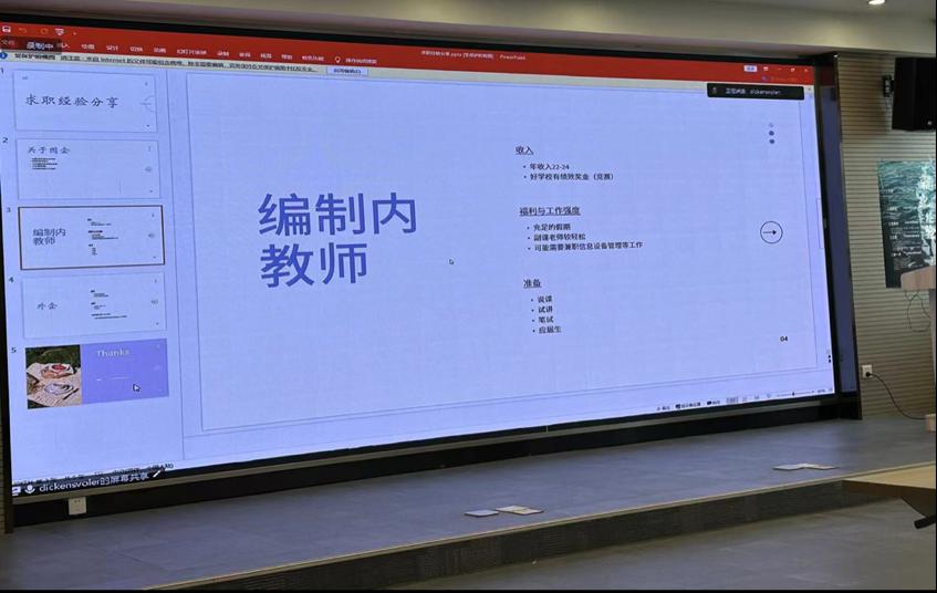 莫一孚主要介绍了教师招聘的经验。他说,深圳教师招聘时间为每年的9月份到次年的7月份,招聘岗位包括深圳各个区属或市属的学校。获取招聘信息的途径有深圳各区教育局公众号、公考雷达等。报名方式一般为官网预报名或现场报名。区属招聘流程为专业知识题和结构化面试,市属招聘流程为专业知识题和课程试讲。各位同学如果想要提高进面录取概率,需要尽早报名,工科类专业可以申请理科岗位或考取数学教师资格证。其中,关内学校招聘要求高、房价贵,而关外新学校较多、活比较多,房价较低适合定居。