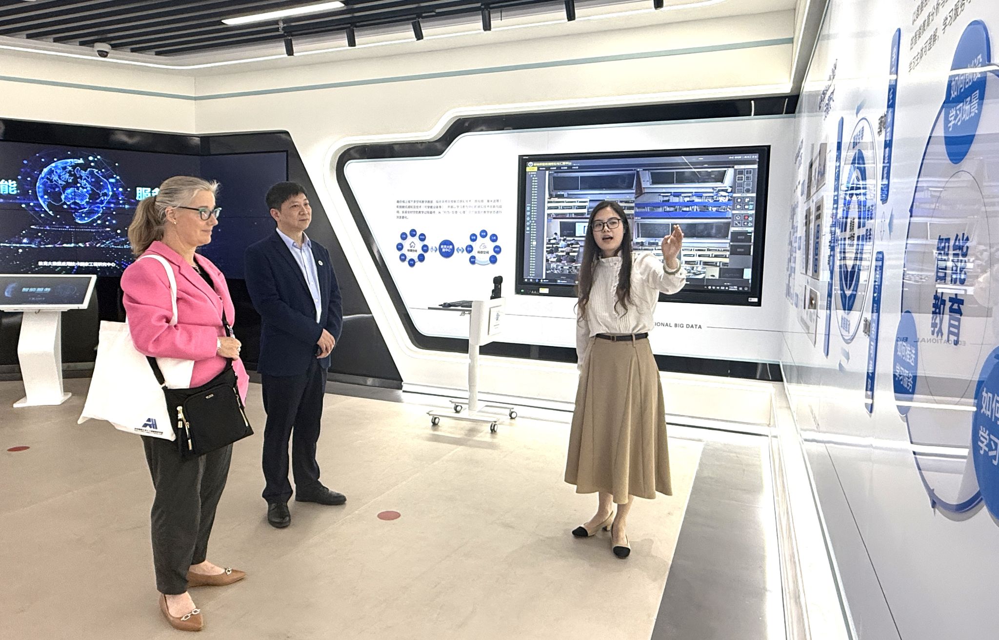 会谈后,代表团一行参观了教育大数据应用技术国家工程研究中心展厅,对我校在数据驱动下的教育评价、个性化学习等教育数字化领域成果和应用表现出浓厚兴趣。