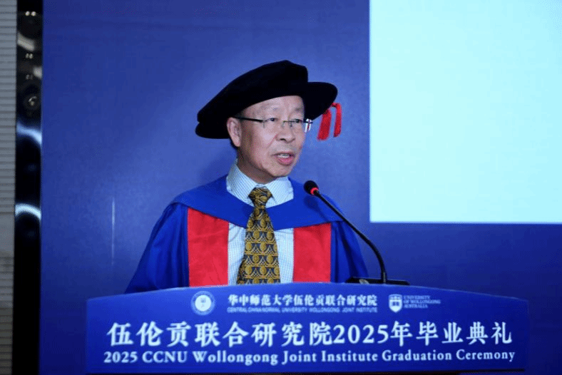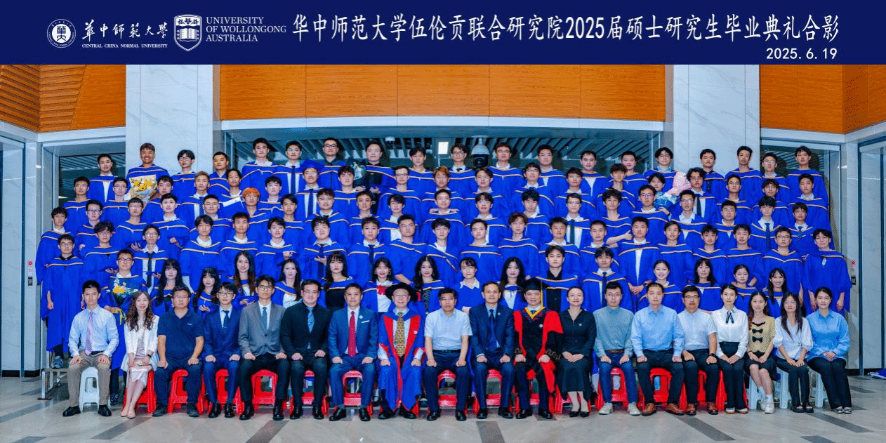 6月19日上午,伍伦贡联合研究院2025年硕士研究生毕业典礼暨伍伦贡大学学位授予仪式在南湖综合楼一楼报告厅举行。华中师范大学校长彭双阶,伍伦贡大学校长逯高清(线上),伍伦贡大学工程与信息科学学部副部长习江涛,华中师范大学国际合作部部长洪峰、人工智能教育学部党委书记黄涛、伍伦贡联合研究院院长杜旭和学院教师出席典礼,130余位毕业生及毕业生家长共同参加了此次典礼。典礼由伍伦贡联合研究院副院长徐君主持。